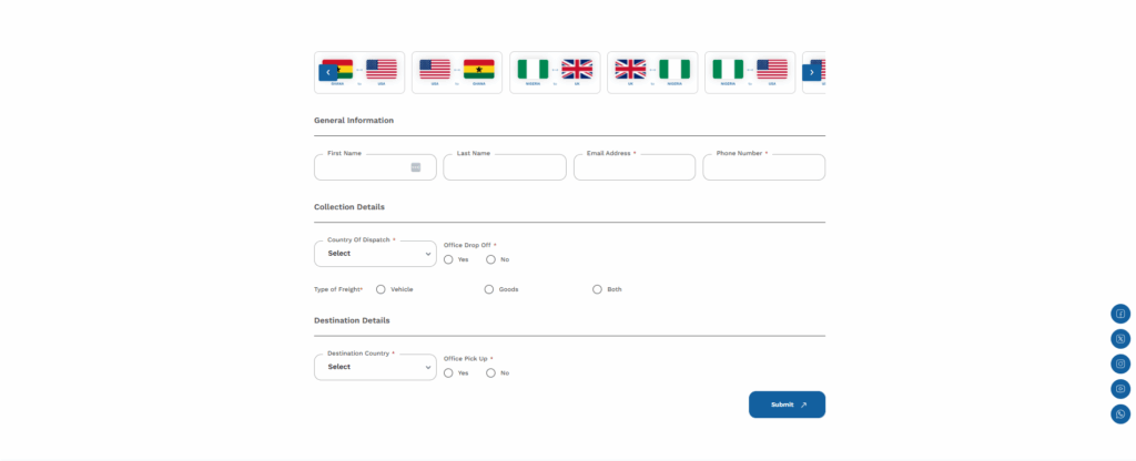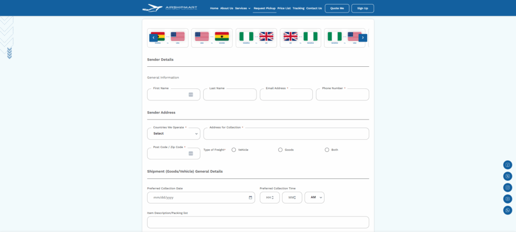 AirshipMart is a modern logistics company that provides efficient air and sea freight services, specializing in door-to-door delivery. Founded in 2024 and based in the UK, it serves as a reliable shipping partner for both individuals and businesses. The company focuses on connecting major markets such as the USA, UK, and Nigeria, offering hassle-free international shipping solutions. With user-friendly features like online shipment tracking and easy pickup requests, AirshipMart aims to simplify the global shipping process and ensure a smooth customer experience.